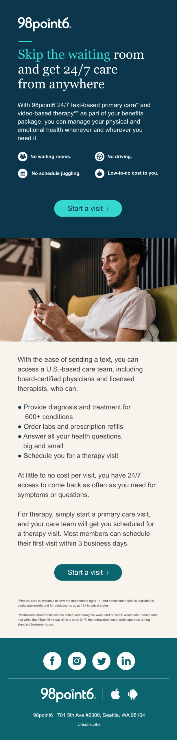 As 98point6 evolved from a hybrid care model into a full-scale SaaS offering, the need for targeted, lifecycle-based marketing became urgent. With multiple customer touchpoints and audience segments—ranging from enterprise healthcare partners to B2B2C subscribers—email had to do more than inform. It had to convert, guide, and reinforce trust.