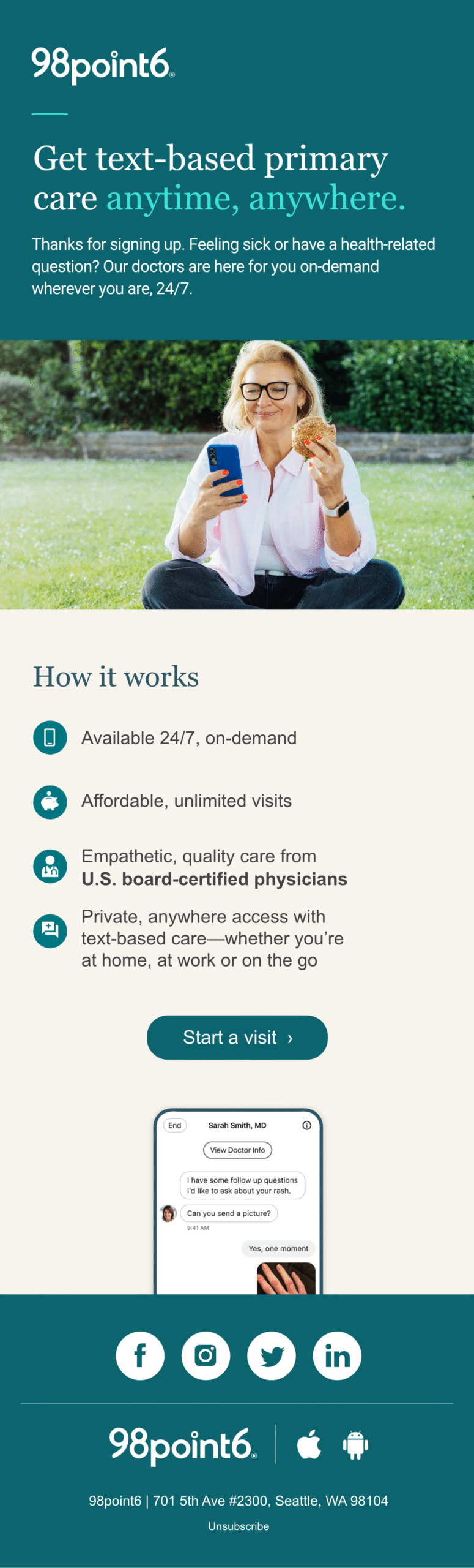 As 98point6 evolved from a hybrid care model into a full-scale SaaS offering, the need for targeted, lifecycle-based marketing became urgent. With multiple customer touchpoints and audience segments—ranging from enterprise healthcare partners to B2B2C subscribers—email had to do more than inform. It had to convert, guide, and reinforce trust