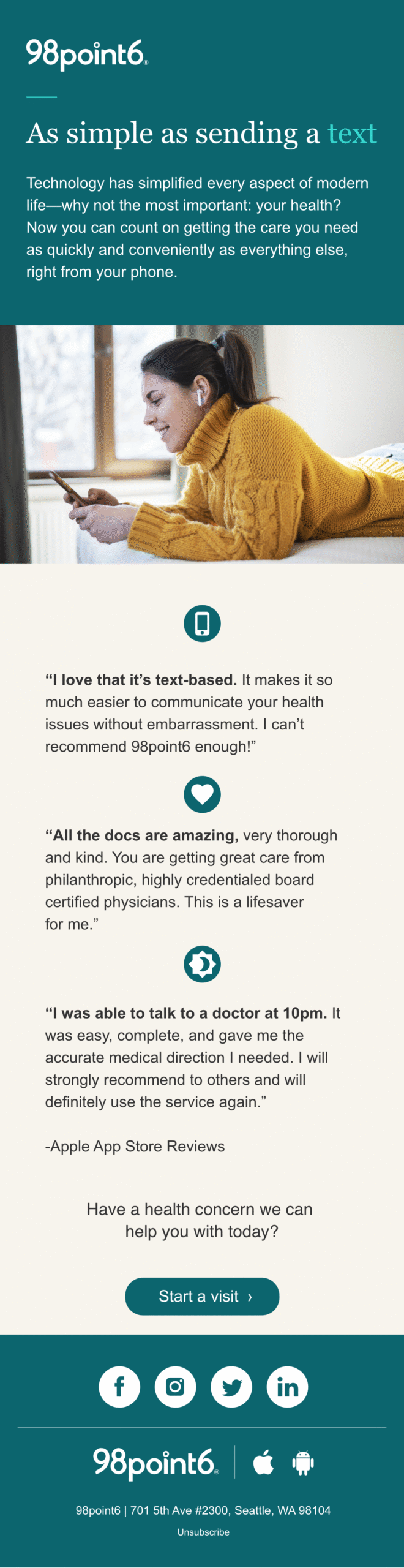 As 98point6 evolved from a hybrid care model into a full-scale SaaS offering, the need for targeted, lifecycle-based marketing became urgent. With multiple customer touchpoints and audience segments—ranging from enterprise healthcare partners to B2B2C subscribers—email had to do more than inform. It had to convert, guide, and reinforce trust