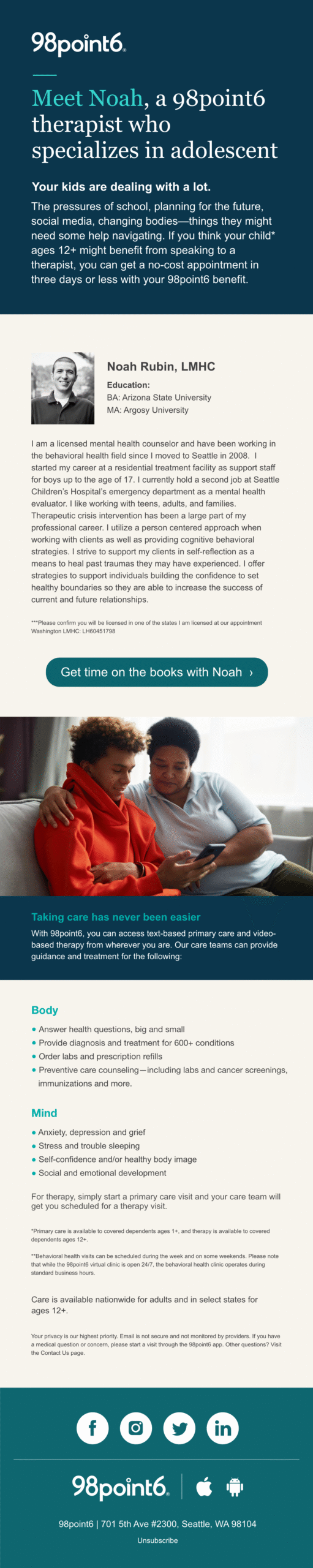 As 98point6 evolved from a hybrid care model into a full-scale SaaS offering, the need for targeted, lifecycle-based marketing became urgent. With multiple customer touchpoints and audience segments—ranging from enterprise healthcare partners to B2B2C subscribers—email had to do more than inform. It had to convert, guide, and reinforce trust